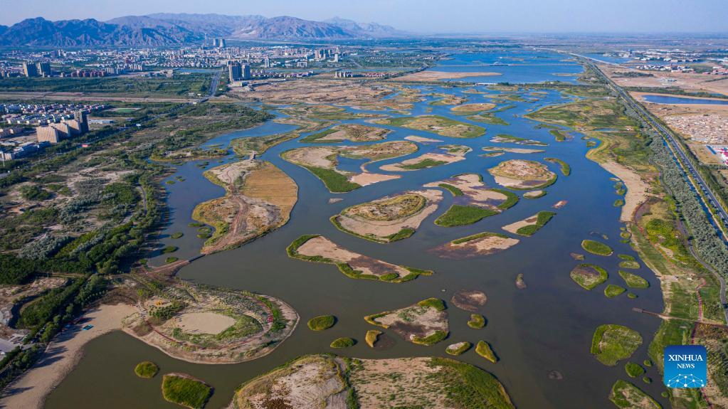Aerial photo taken on May 30, 2022 shows the scenery of Xinghai Lake in Shizuishan City, northwest China's Ningxia Hui Autonomous Region. (Xinhua/Yang Zhisen)