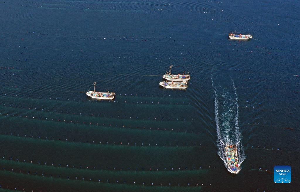 Aerial photo taken on May 31, 2022 shows fishermen working in a marine ranch at Haiyangdao Township of Changhai County in Dalian, northeast China's Liaoning Province. More than 10 state-level marine ranch demonstration zones have been approved in Changhai County since 2016. (Xinhua/Yao Jianfeng)