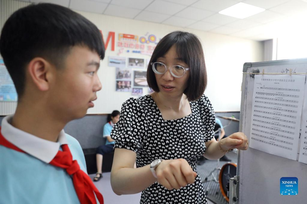 Teacher Sun Shicha (R) explains knowledge of music to student Zhao Jin'ao at the music classroom of Xinji Special Education School in Xinji, north China's Hebei Province, May 31, 2022. In the municipal special-education school of Xinji City, Hebei Province, a jazz drumming band named "Against the Wind" is making hopeful beats in world of silence. Founded in December 2018, the band is home to 10 students with hearing impairment or intellectual disability. The band has been undergoing systematic and hard training since its establishment and the endeavors paid off when the band made a stunning rendering in the city's cultural performance among primary and secondary school students. "I named the band 'Against the Wind' to encourage the students to hold onto their dreams, have the grit to face up to challenges and new things as well as fly bravely toward their bright futures," said Sun Shicha, a teacher of the special-education school and the organizer of the jazz drumming band. In 2020, the school created a specialized music classroom, where the band can carry out routine practices. So far, the drum band is able to perform some 10 pieces of music. "The drum band has an invisible and formative influence on teenagers," said Sun. "The students are seen with more resilience and confidence since they joined the band. Meanwhile, their ability in terms of coordination and comprehension have also greatly improved." (Xinhua/Luo Xuefeng)