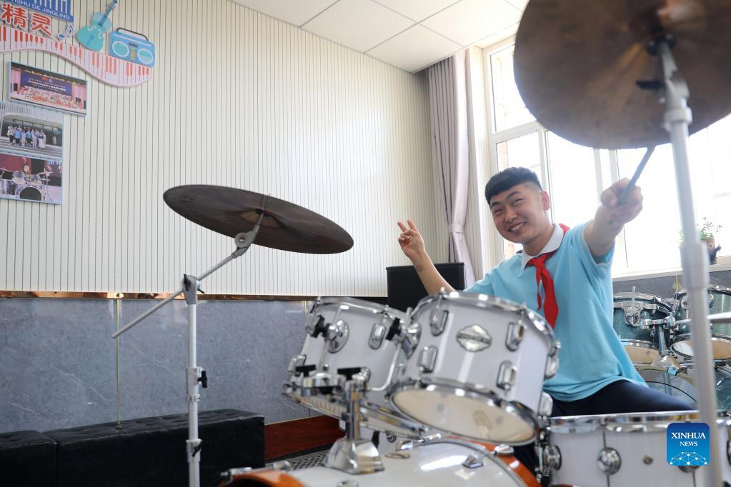 Student Wang Hede practices playing the drum set at the music classroom of Xinji Special Education School in Xinji, north China's Hebei Province, May 31, 2022. In the municipal special-education school of Xinji City, Hebei Province, a jazz drumming band named "Against the Wind" is making hopeful beats in world of silence. Founded in December 2018, the band is home to 10 students with hearing impairment or intellectual disability. The band has been undergoing systematic and hard training since its establishment and the endeavors paid off when the band made a stunning rendering in the city's cultural performance among primary and secondary school students. "I named the band 'Against the Wind' to encourage the students to hold onto their dreams, have the grit to face up to challenges and new things as well as fly bravely toward their bright futures," said Sun Shicha, a teacher of the special-education school and the organizer of the jazz drumming band. In 2020, the school created a specialized music classroom, where the band can carry out routine practices. So far, the drum band is able to perform some 10 pieces of music. "The drum band has an invisible and formative influence on teenagers," said Sun. "The students are seen with more resilience and confidence since they joined the band. Meanwhile, their ability in terms of coordination and comprehension have also greatly improved." (Xinhua/Luo Xuefeng)