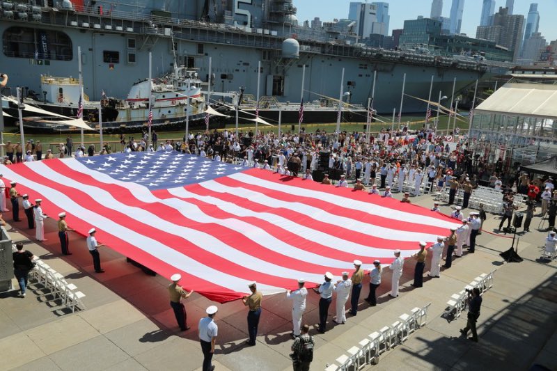 People unfurl an American flag during an event marking Memorial Day at the Intrepid Sea, Air and Space Museum in New York, the United States, on May 30, 2022. (Xinhua/Liu Yanan)
