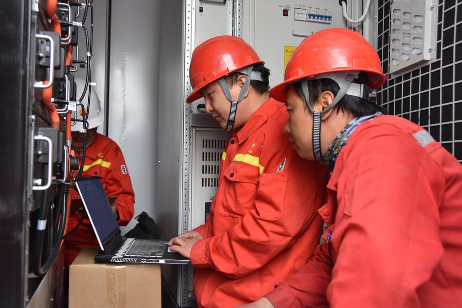 Workers of PetroChina's Tarim oilfield branch set up photovoltaic equipment along the Tarim Desert Road in northwest China's Xinjiang Uygur Autonomous Region, March 20, 2022. (Xinhua/Gu Yu)