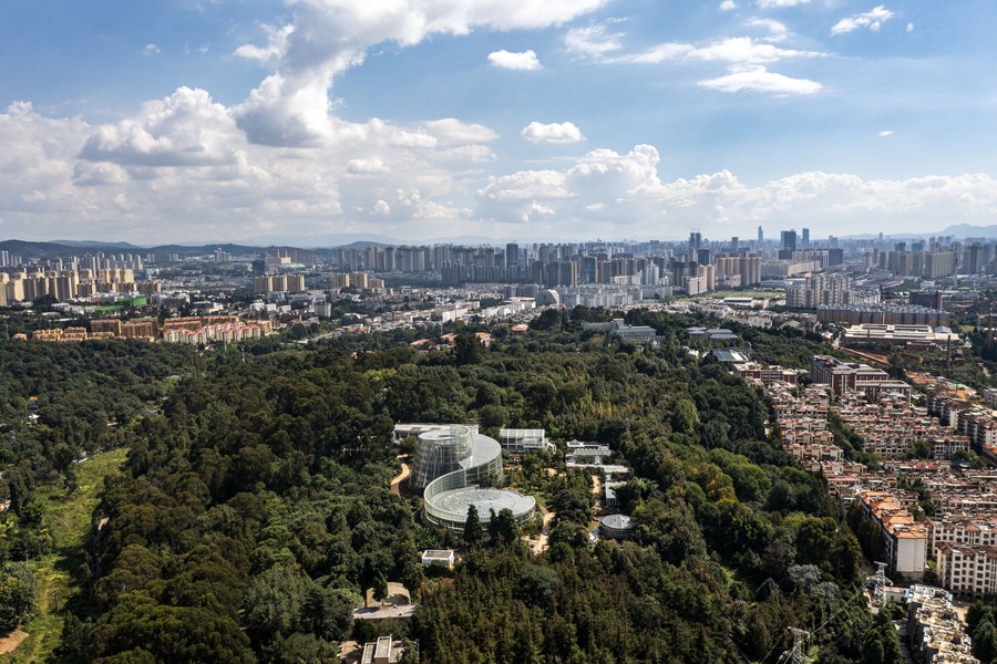 Aerial photo taken on Sept. 26, 2021 shows the view of the Fuligong Greenhouses at Kunming Botanical Garden in Kunming, southwest China's Yunnan Province. (Xinhua/Jiang Wenyao)