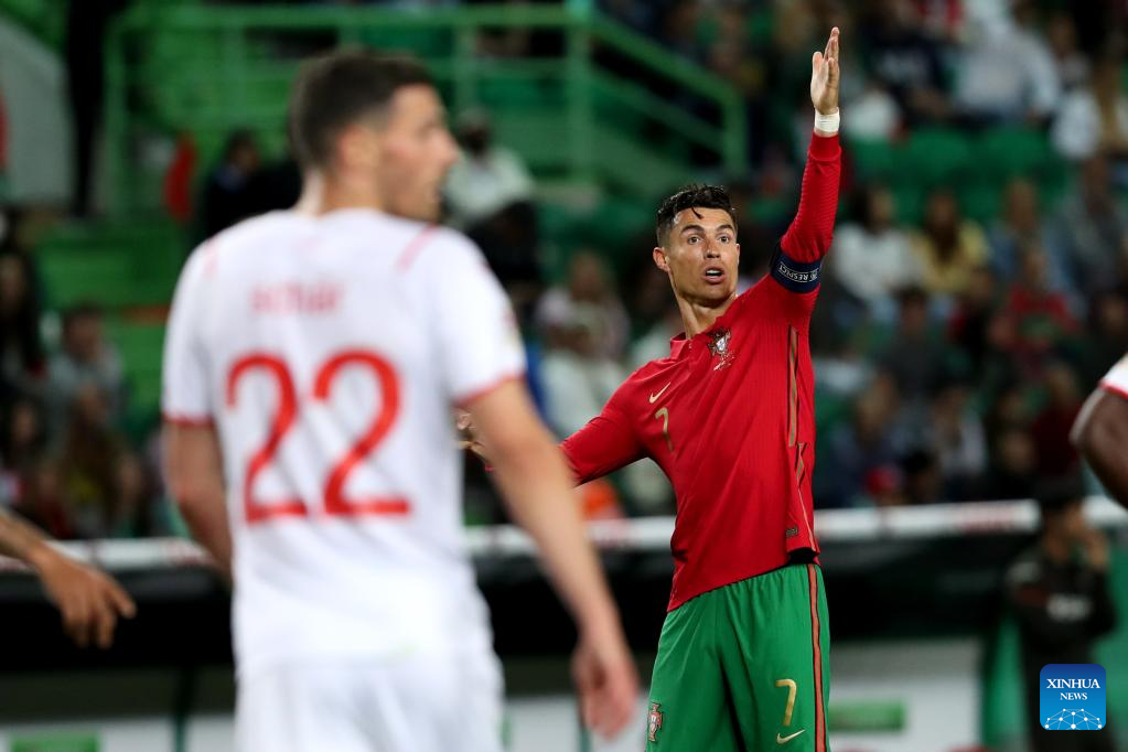 Portugal's Cristiano Ronaldo gestures during the UEFA Nations League football match between Portugal and Switzerland in Lisbon, Portugal, on June 5, 2022. (Photo by Pedro Fiuza/Xinhua)