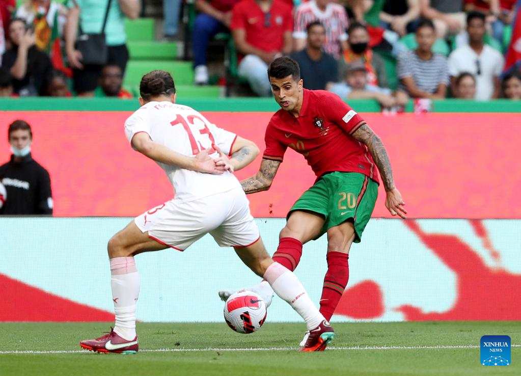 Portugal's Diogo Jota (L) vies with Switzerland's Kevin Mbabu during their UEFA Nations League football match in Lisbon, Portugal, on June 5, 2022. (Photo by Pedro Fiuza/Xinhua)
