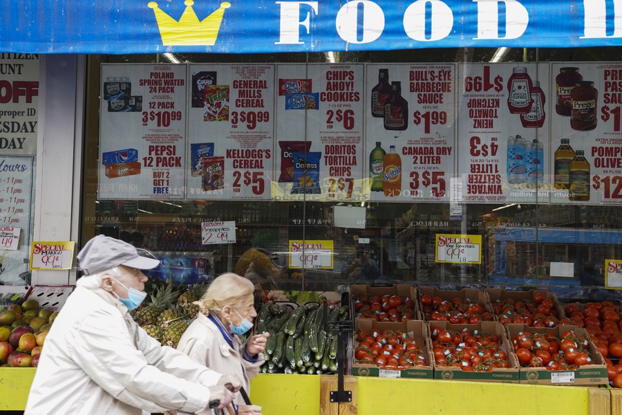 Pedestrians walk past a store in New York, the United States, May 11, 2022. (Xinhua/Wang Ying)