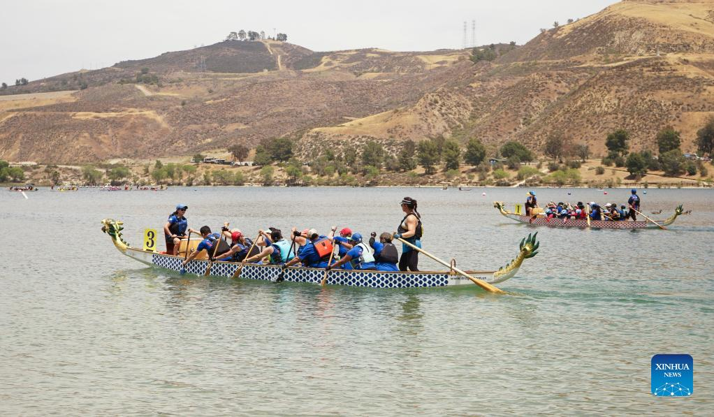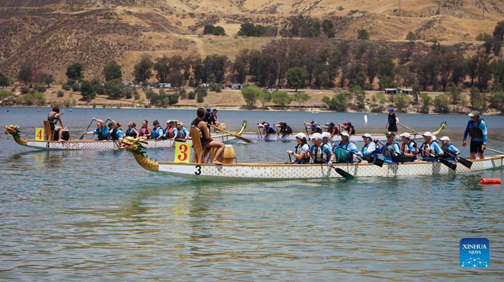 CASTAIC, the United States, June 6 (Xinhua) -- Shimmering white tents lined the waterfront, providing shade and refreshments for the hundreds of dragonboat paddlers and attendees from all over California, who converged on or around the Castaic Lake for a festive competition.