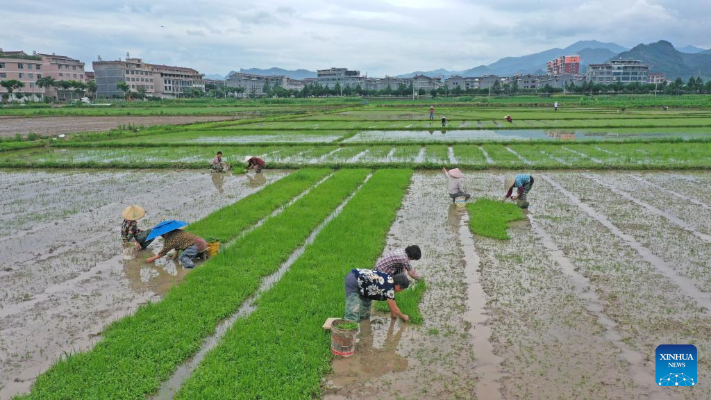 Aerial photo taken on June 5, 2022 shows farmers busy working in the field ahead of the day of "Mangzhong", or "Grain in Ear", in Xitou Village, Hengxi Township of Xianju County, Taizhou, east China's Zhejiang Province.