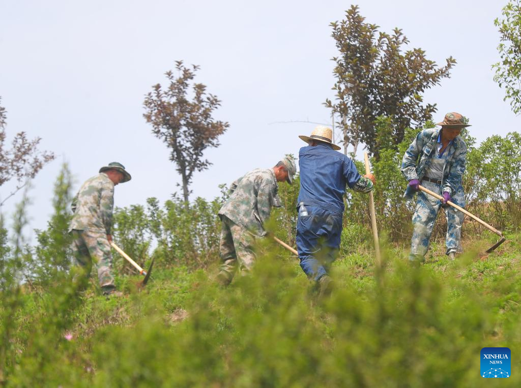 Workers plant trees at the former west open-air mining pit in Fushun City, northeast China's Liaoning Province, June 2, 2022.