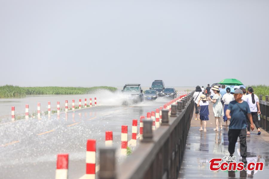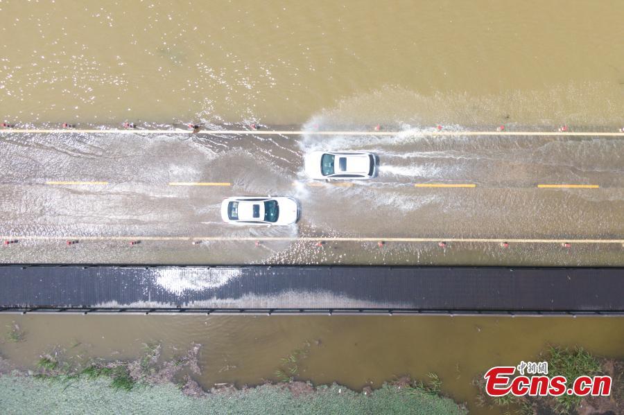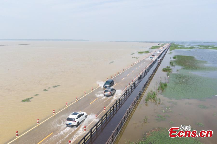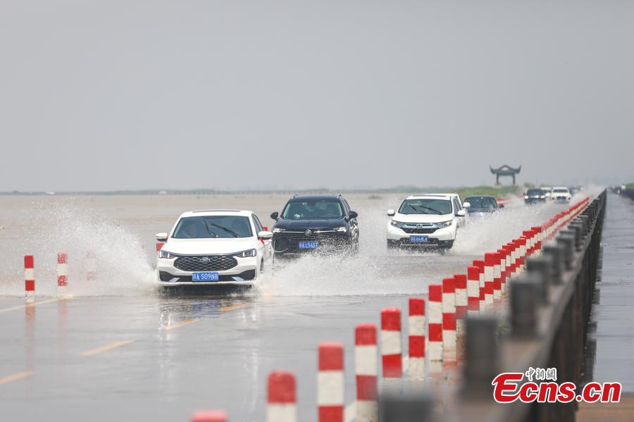 Cars drive on the Dahuchi section of Yongwu Road submerged in rising water of the Poyang Lake due to heavy rainfall in Jiujiang city, east China's Jiangxi Province, June 6, 2022. (Photo: China News Service/Liu Lixin)