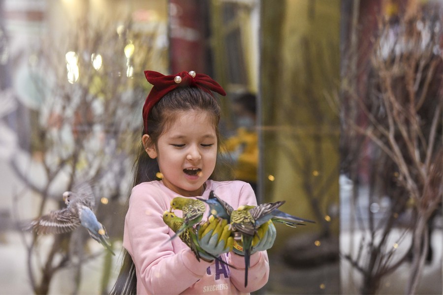 A girl has fun with birds at an amusement park in Urumqi, capital of Northwest China's Xinjiang Uygur autonomous region, at 7:20 pm on Dec 21, 2021. [Photo/Xinhua]