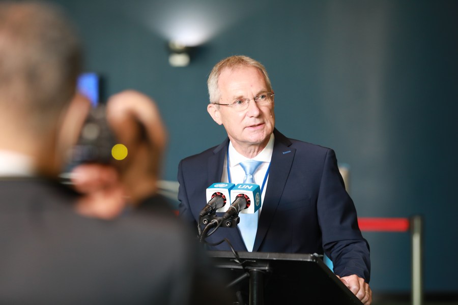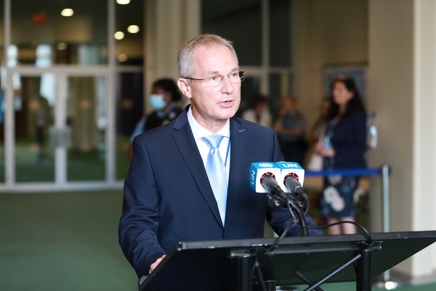 Hungarian diplomat Csaba Korosi speaks after being elected the president of the upcoming 77th session of the UN General Assembly at the UN headquarters in New York, on June 7, 2022. (Xinhua/Xie E)
