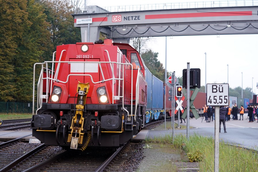 China-Europe freight train "Shanghai Express" is seen in Hamburg, Germany, on Oct. 26, 2021.(Xinhua/Wang Qing)