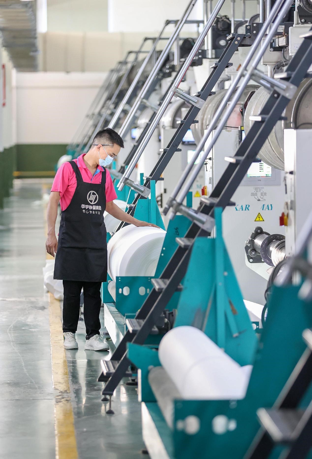 A worker checks weaving machines at a smart factory of a textile company in Jinjiang city, east China’s Fujian province, March 8, 2022. (People’s Daily Online/ Dong Yanjun)