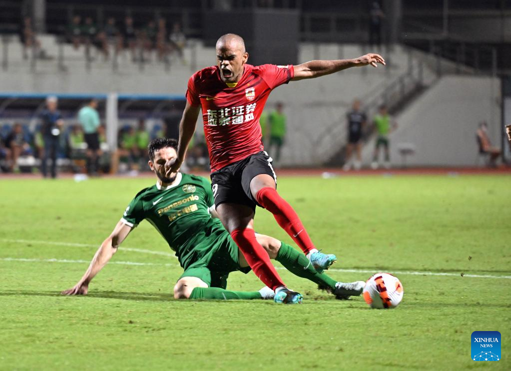 Gleidionor Figueiredo Pinto Junior (R) of Changchun Yatai competes during a 2022 season Chinese Football Association Super League (CSL) match between Zhejiang FC and Changchun Yatai FC in Haikou, south China's Hainan Province, June 7, 2022. (Xinhua/Guo Cheng)