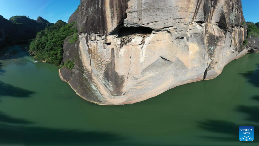 Aerial photo taken on June 6, 2022 shows the ancient relic of rock shelters with wooden boat coffins of Mount Wuyi in southeast China's Fujian Province.