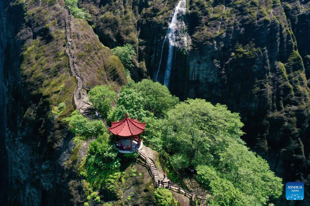 Aerial photo taken on June 6, 2022 shows tourists visiting Mount Wuyi in southeast China's Fujian Province.