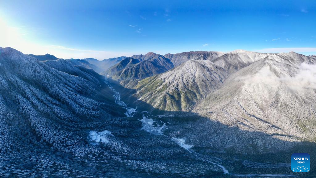 Aerial photo taken on Jan. 8, 2021 shows the snowy scenery of Mount Wuyi in southeast China's Fujian Province.