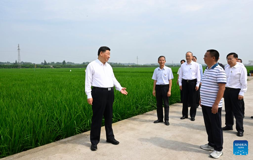 Chinese President Xi Jinping, also general secretary of the Communist Party of China Central Committee and chairman of the Central Military Commission, visits the village of Yongfeng to learn about local efforts in advancing high-standard farmland development, boosting grain production, promoting rural revitalization, maintaining effective COVID-19 prevention and control, in Meishan, southwest China's Sichuan Province, June 8, 2022.