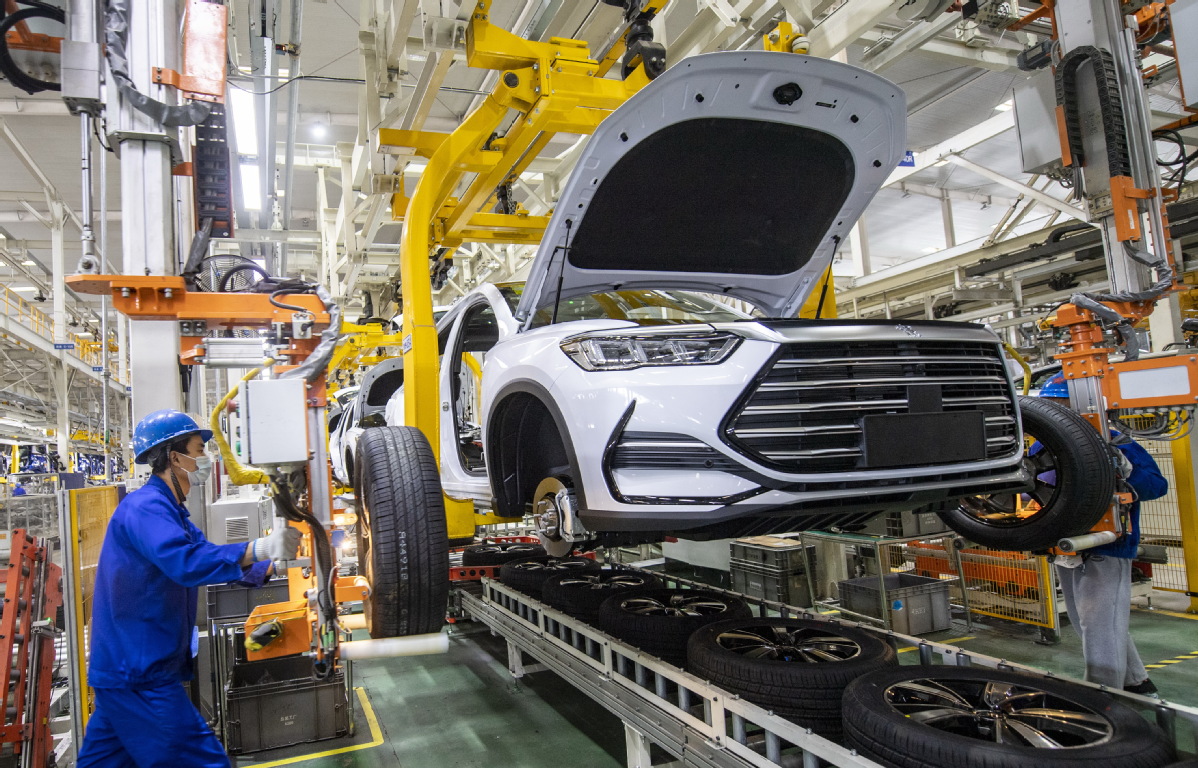 Employees work on a production line of NEV maker BYD in Xi'an, Shaanxi province. [YUAN JINGZHI/FOR CHINA DAILY]