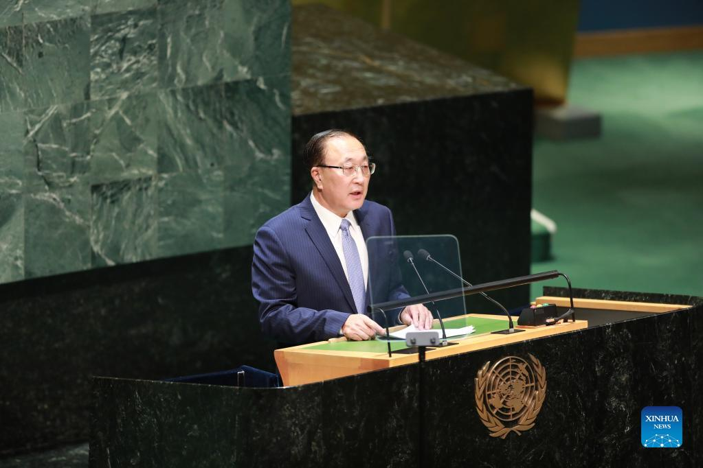 Zhang Jun, China's permanent representative to the United Nations, speaks at a UN General Assembly debate on the Korean Peninsula issue at the UN headquarters in New York, on June 8, 2022. The Chinese envoy on Wednesday called on the United States to take meaningful, concrete actions to relieve tensions on the Korean Peninsula. (Xinhua/Xie E)