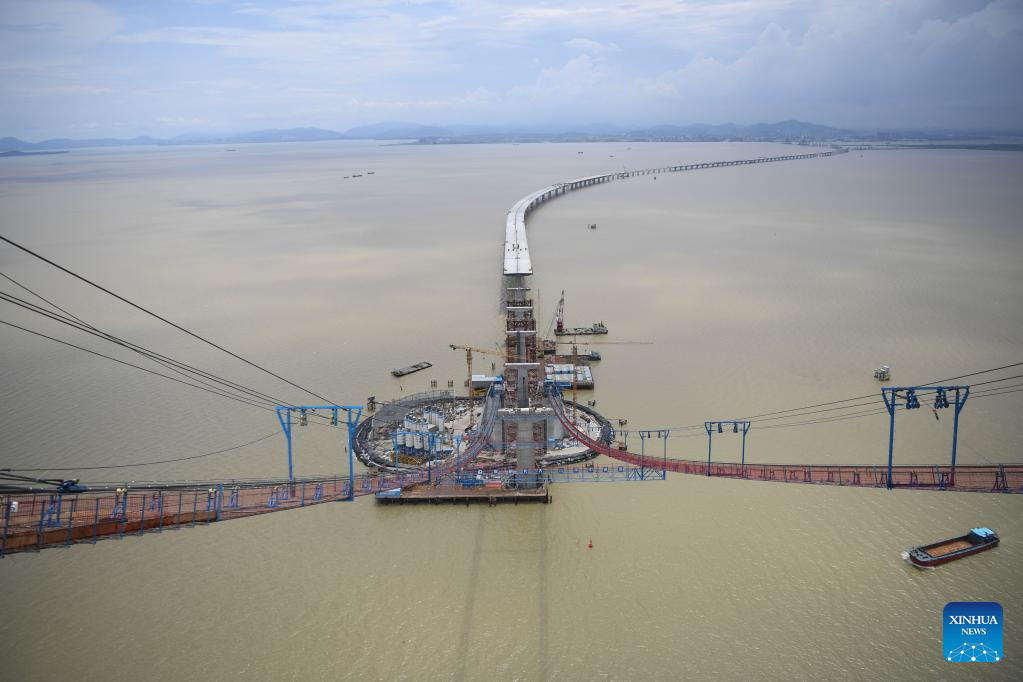 Photo taken on June 7, 2022 shows the Lingdingyang Bridge under construction as part of the Shenzhen-Zhongshan link in south China.