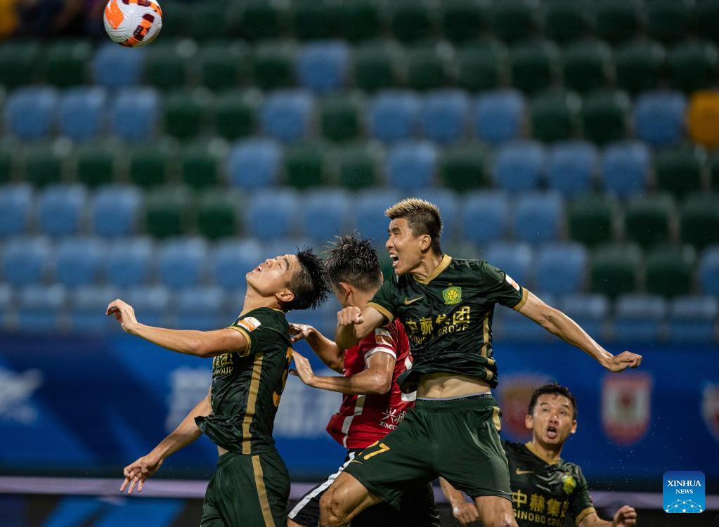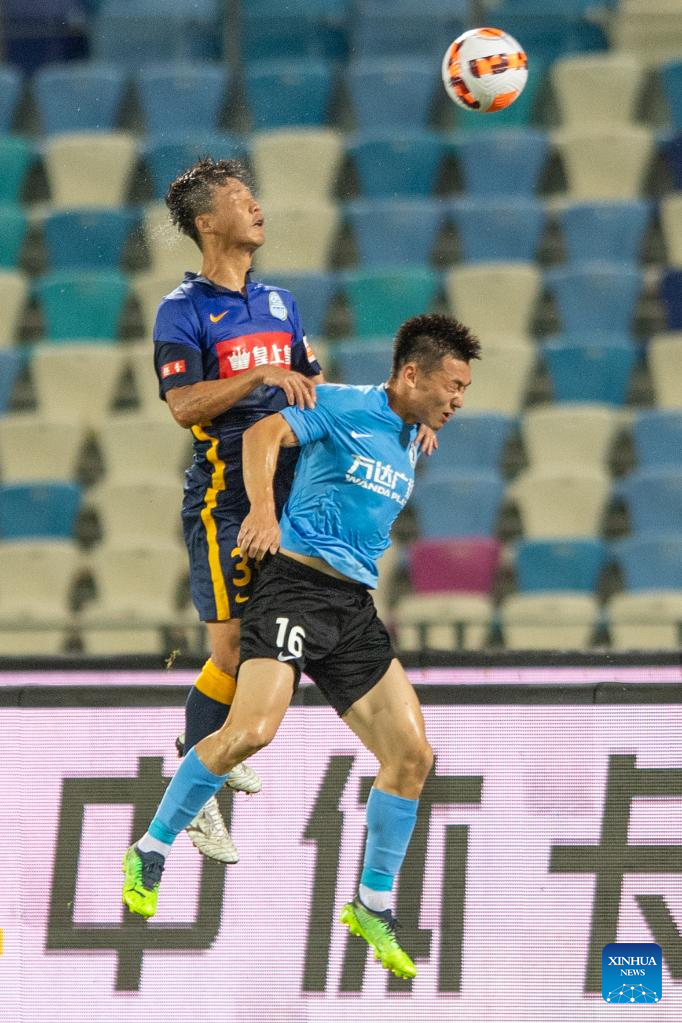 Huang Zhengyu (L) of Guangzhou City heads the ball during a 2022 season Chinese Football Association Super League (CSL) match between Dalian Pro and Guangzhou City in Haikou, south China's Hainan Province, June 8, 2022. (Xinhua/Hu Zhixuan)