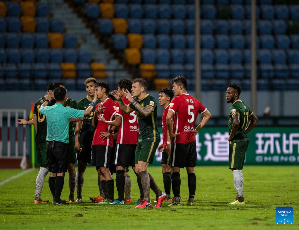 Dong Yanfeng (L) of Dalian Pro vies with Wu Chengru of Guangzhou City during a 2022 season Chinese Football Association Super League (CSL) match between Dalian Pro and Guangzhou City in Haikou, south China's Hainan Province, June 8, 2022. (Xinhua/Hu Zhixuan)