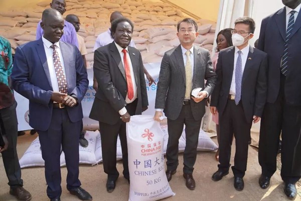 A handover ceremony of emergency food assistance provided by China for South Sudan is held in Juba, capital of South Sudan, Dec. 15, 2021. (Photo/Courtesy of China International Development Cooperation Agency)