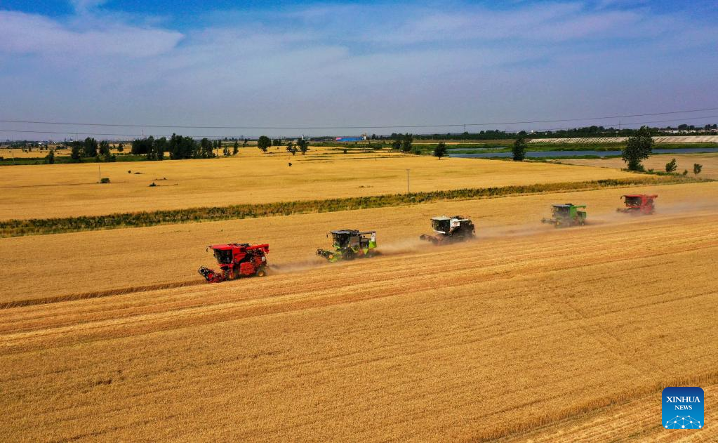 Aerial photo taken on June 8, 2022 shows harvesters working in wheat fields in Xisong Village of Sansi Township, Xingtai City, north China's Hebei Province. (Xinhua/Zhu Xudong)