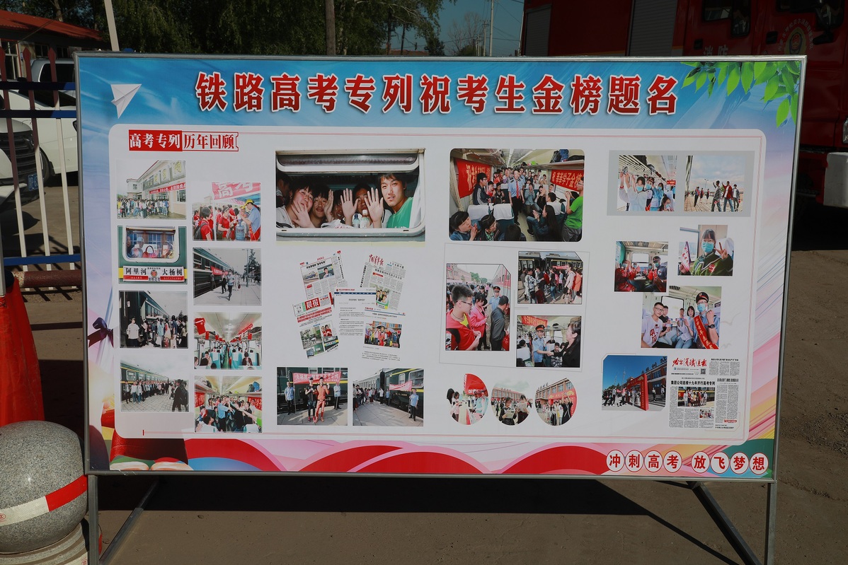 A display board show photos of the special train that once transported students, parents and teachers to a distant testing center. [Photo by Yuan Yong/For chinadaily.com.cn]