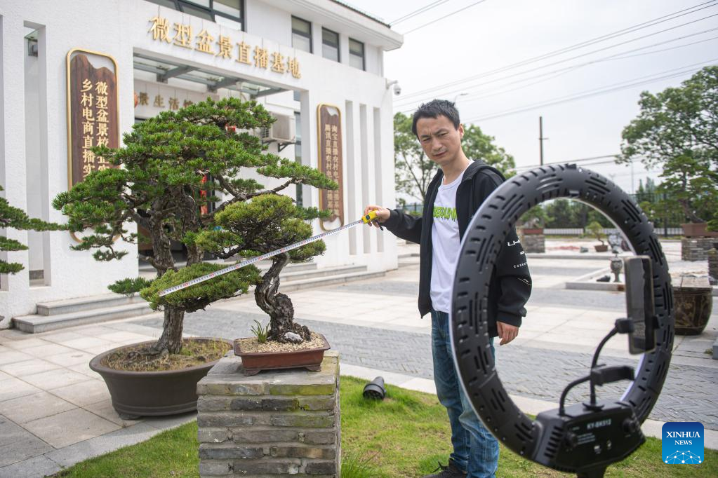 A villager sells a potted landscape through livestreaming in Ningbo, east China's Zhejiang Province, May 19, 2022.(Xinhua/Jiang Han)