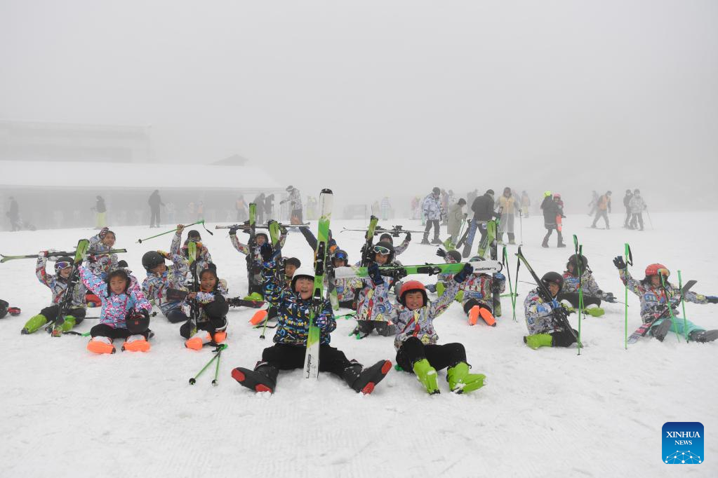 Elementary school students pose for a photo after skiing training in Anji County of Huzhou, east China's Zhejiang Province, Jan. 9, 2022.