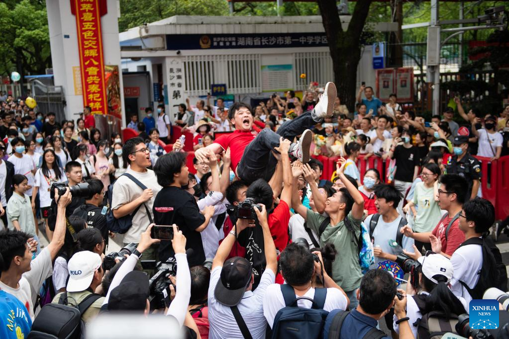 Examinees and their teacher celebrate out of an exam site of national college entrance exam in Changsha, central China's Hunan Province, June 9, 2022. The annual exam, better known as the "gaokao," saw a record 11.93 million candidates signing up this year. (Xinhua/Chen Sihan)