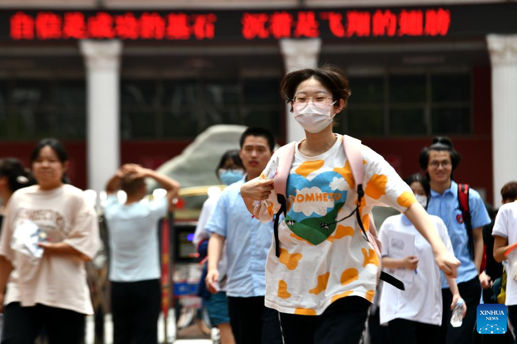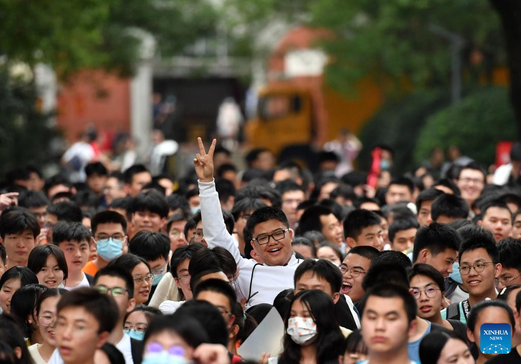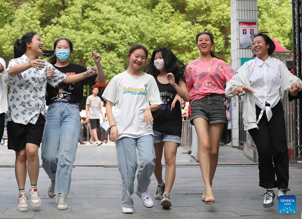 Examinees walk out of an exam site of national college entrance exam in Changsha, central China's Hunan Province, June 9, 2022. The annual exam, better known as the "gaokao," saw a record 11.93 million candidates signing up this year. (Xinhua/Chen Zhenhai)