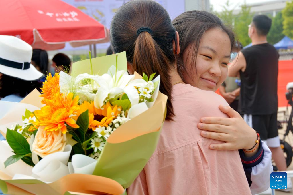 An examinee (L) receives a bunch of flowers from her parent out of an exam site of national college entrance exam in Changsha, central China's Hunan Province, June 9, 2022. The annual exam, better known as the "gaokao," saw a record 11.93 million candidates signing up this year. (Xinhua/Chen Sihan)