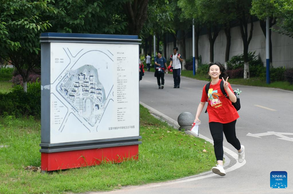 (220609) -- YICHANG, June 9, 2022 (Xinhua) -- An examinee runs out of an exam site of national college entrance exam in Yichang, central China's Hubei Province, June 9, 2022. The annual exam, better known as the "gaokao," saw a record 11.93 million candidates signing up this year. (Photo by Wang Huifu/Xinhua)