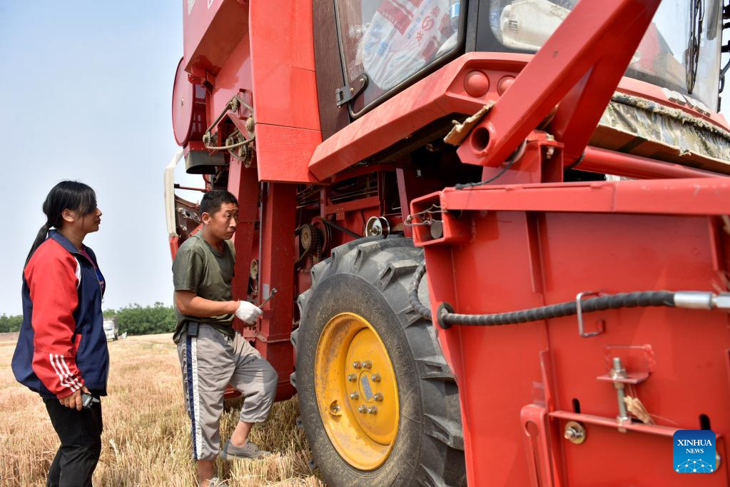 Tang Jumin (R) maintains a harvester during the break of harvesting wheat in the field at Hancun Village in Xingtai, north China's Hebei Province, June 9, 2022.