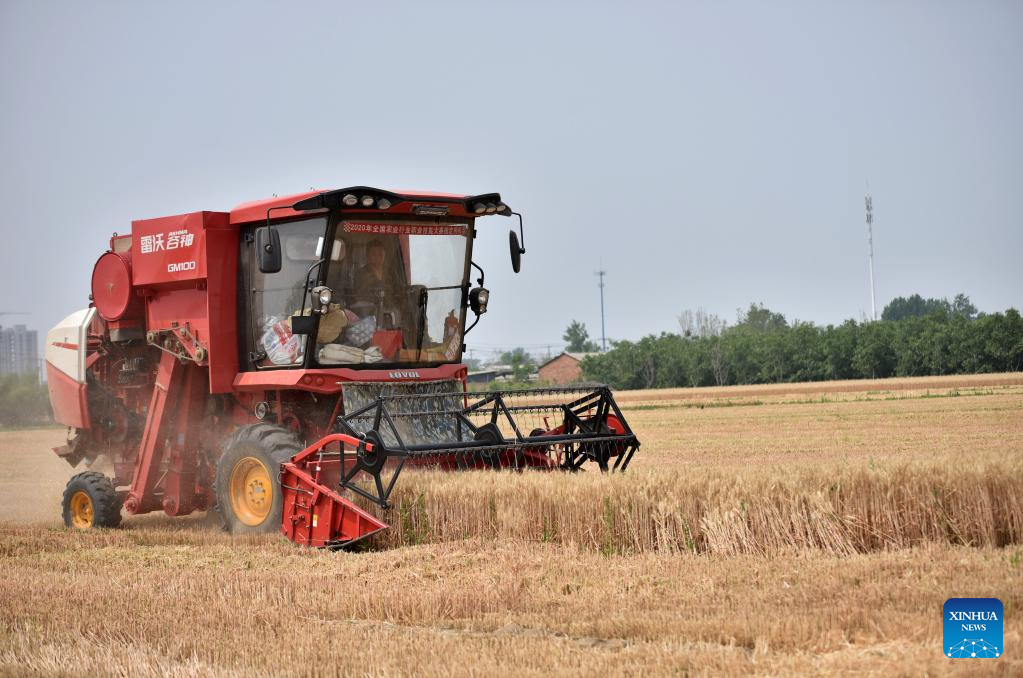 Tang Jumin drives a harvester to reap wheat in the field at Hancun Village in Xingtai, north China's Hebei Province, June 9, 2022.