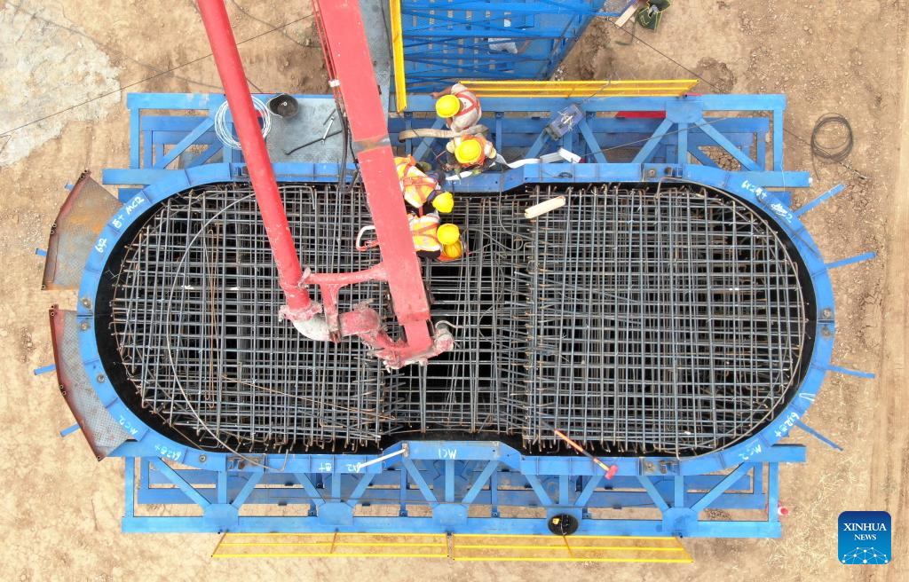 Aerial photo taken on June 9, 2022 shows a pier being concreted at the construction site of the Xi'an-Shiyan high-speed railway in Xi'an, northwest China's Shaanxi Province.