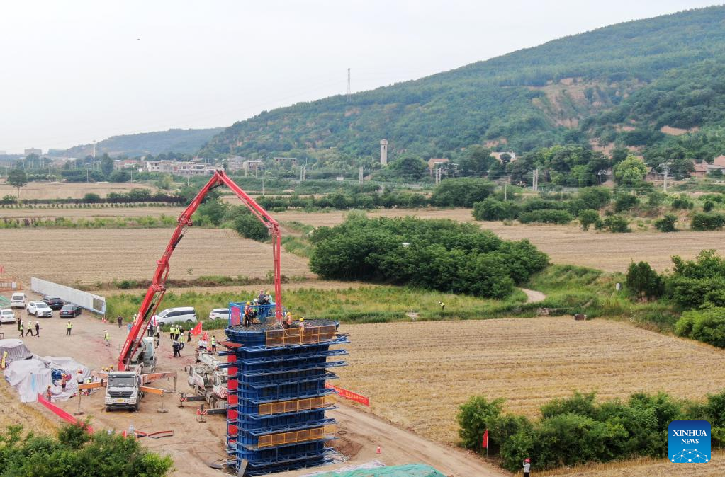Aerial photo taken on June 9, 2022 shows a pier being concreted at the construction site of the Xi'an-Shiyan high-speed railway in Xi'an, northwest China's Shaanxi Province.