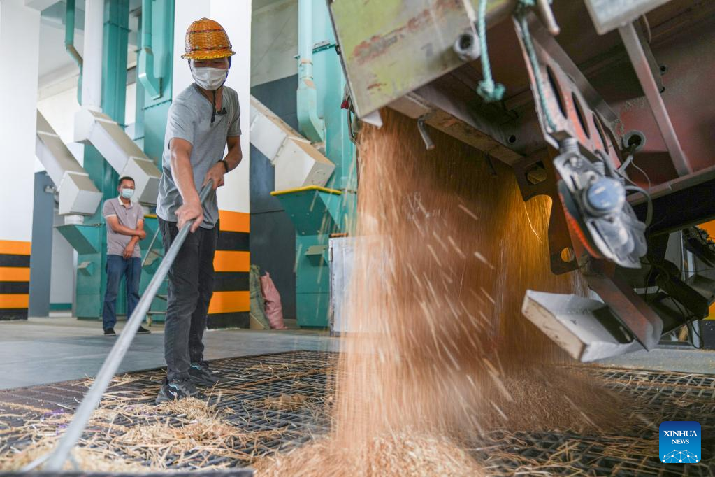 A staff member works at a wheat processing plant in Woyang County of Bozhou City, east China's Anhui Province, June 7, 2022. (Xinhua/Du Yu)