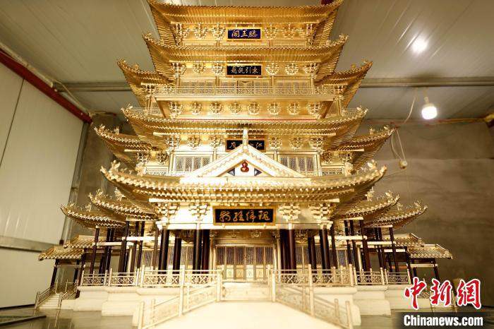 The four-story model is 1.8 meters long, 1.7 meters wide and 1.6 meters high. It vividly represents the magnificence and exquisite designs of the ancient building. The architectural style and details of the model, such as its eaves, rafters, arches, columns, column caps, and horizontal inscribed boards, were all created according to an ancient book on architecture, which is considered an encyclopedia of architecture in ancient China.