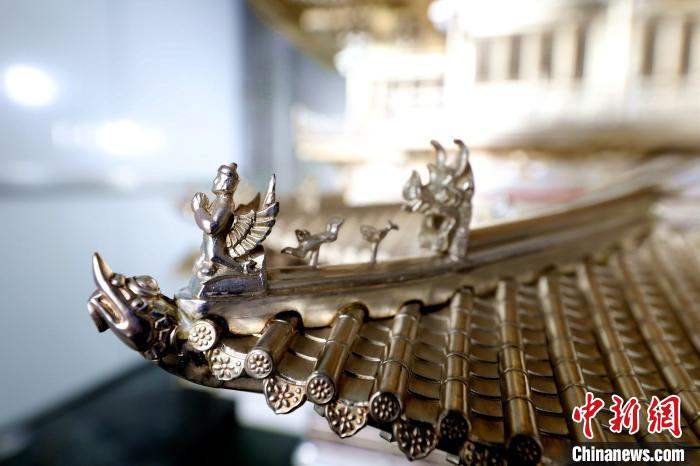 Photo shows a part of the well-designed overhanging eaves of a handmade model of the Tengwang Pavilion created by Chinese craftsman Qian Haiqiang with silver. (Photo/Sha Fei)