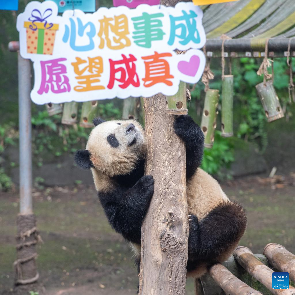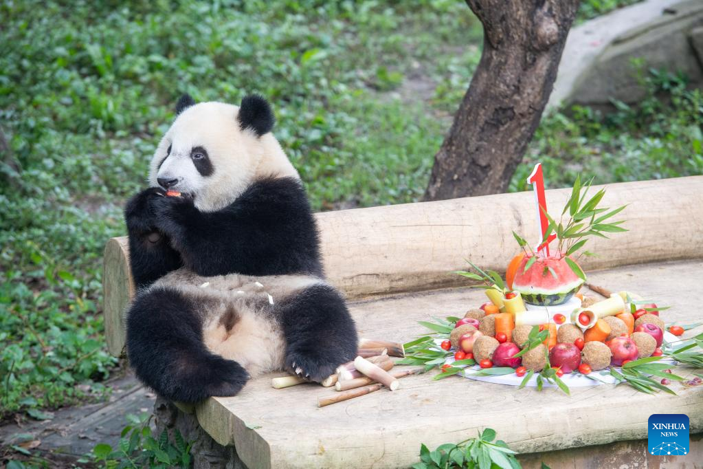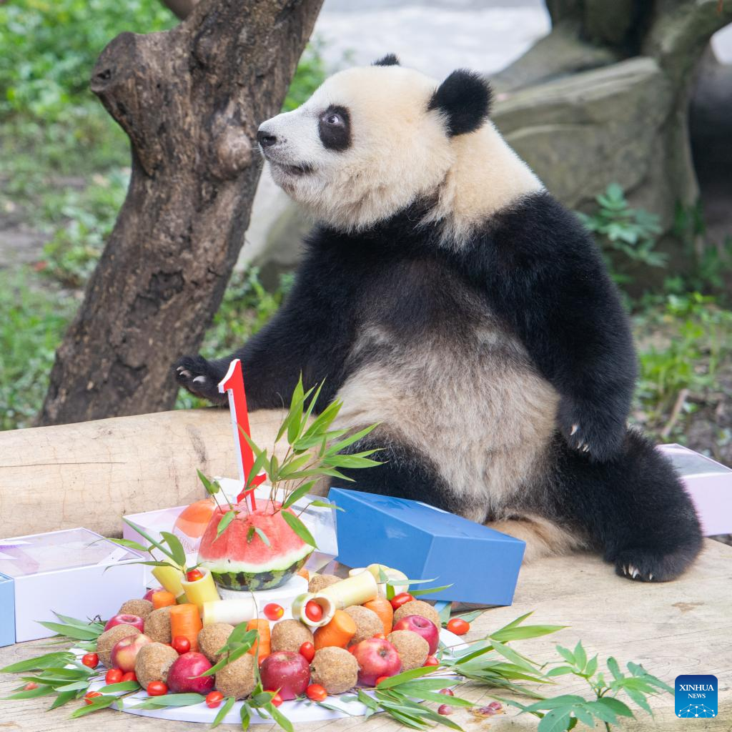 A giant panda plays during a birthday party at the Chongqing Zoo in southwest China's Chongqing Municipality, June 10, 2022. The Chongqing Zoo held a birthday party for two one-year-old giant pandas named Xingxing, Chenchen, and four three-year-old giant pandas Shuangshuang, Chongchong, Xixi, Qingqing respectively. (Xinhua/Tang Yi)