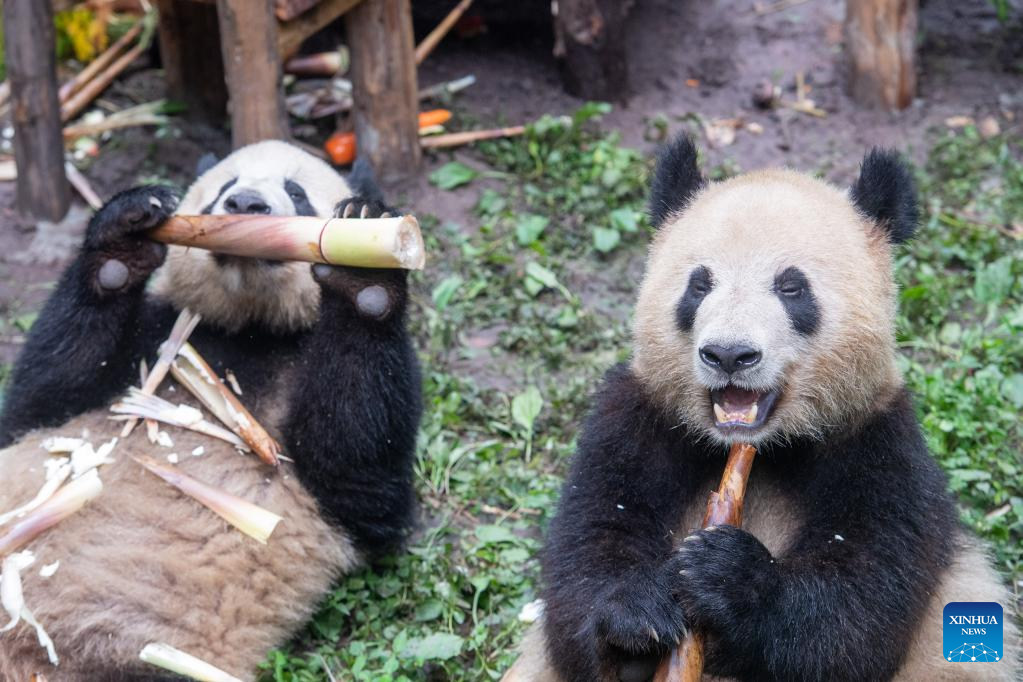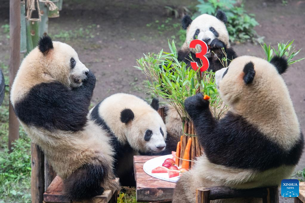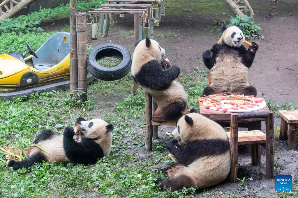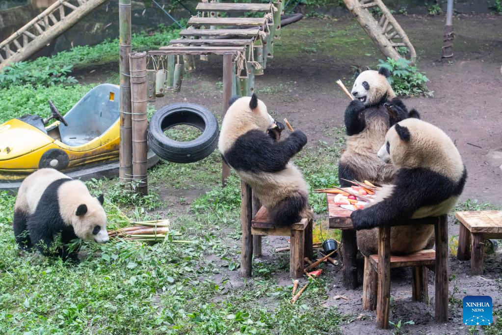 Giant pandas enjoy food during their birthday party at the Chongqing Zoo in southwest China's Chongqing Municipality, June 10, 2022. The Chongqing Zoo held a birthday party for two one-year-old giant pandas named Xingxing, Chenchen, and four three-year-old giant pandas Shuangshuang, Chongchong, Xixi, Qingqing respectively. (Xinhua/Tang Yi)