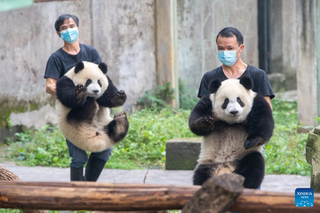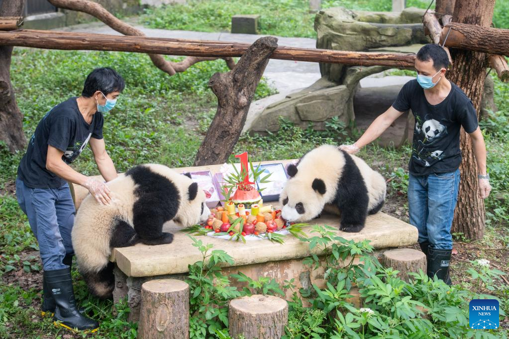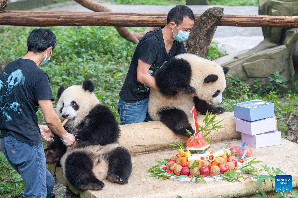 Breeders take care of giant pandas during their birthday party at the Chongqing Zoo in southwest China's Chongqing Municipality, June 10, 2022. The Chongqing Zoo held a birthday party for two one-year-old giant pandas named Xingxing, Chenchen, and four three-year-old giant pandas Shuangshuang, Chongchong, Xixi, Qingqing respectively. (Xinhua/Tang Yi)