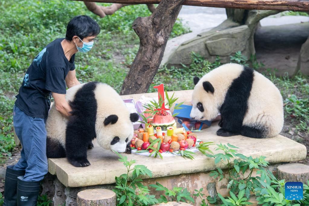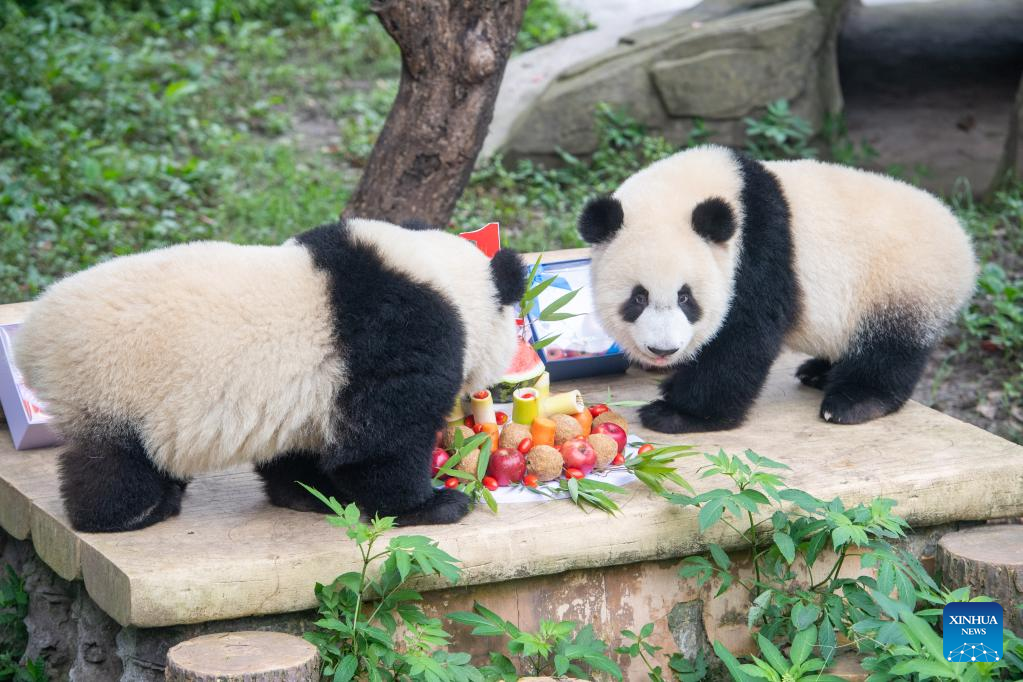 Giant pandas play during their birthday party at the Chongqing Zoo in southwest China's Chongqing Municipality, June 10, 2022. The Chongqing Zoo held a birthday party for two one-year-old giant pandas named Xingxing, Chenchen, and four three-year-old giant pandas Shuangshuang, Chongchong, Xixi, Qingqing respectively. (Xinhua/Tang Yi)