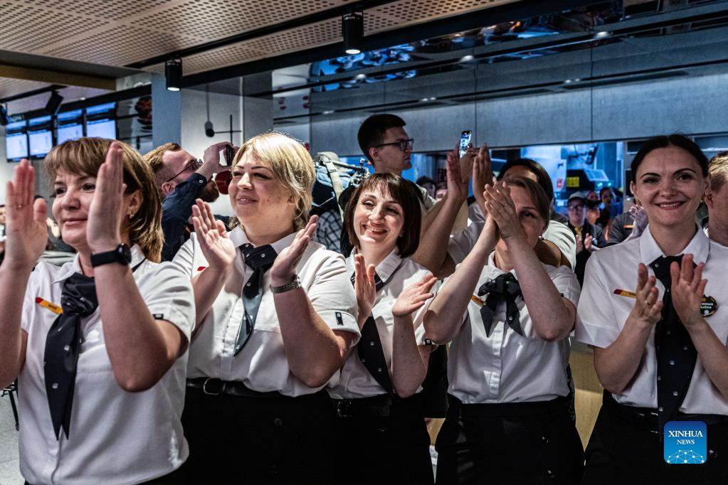 Employees celebrate during the opening ceremony at the newly opened fast food restaurant in a former McDonald's outlet in central Moscow, Russia, on June 12, 2022. The successor to McDonald's in Russia, "Vkusno - i tochka," reopened the first batch of 15 restaurants in Moscow and its suburbs on Sunday, three months after the U.S. fast-food chain ended its business in Russia. (Xinhua/Bai Xueqi)