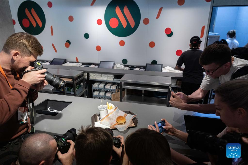 Journalists take pictures of hamburgers at the newly opened fast food restaurant in a former McDonald's outlet in central Moscow, Russia, on June 12, 2022. The successor to McDonald's in Russia, "Vkusno - i tochka," reopened the first batch of 15 restaurants in Moscow and its suburbs on Sunday, three months after the U.S. fast-food chain ended its business in Russia. (Xinhua/Bai Xueqi)